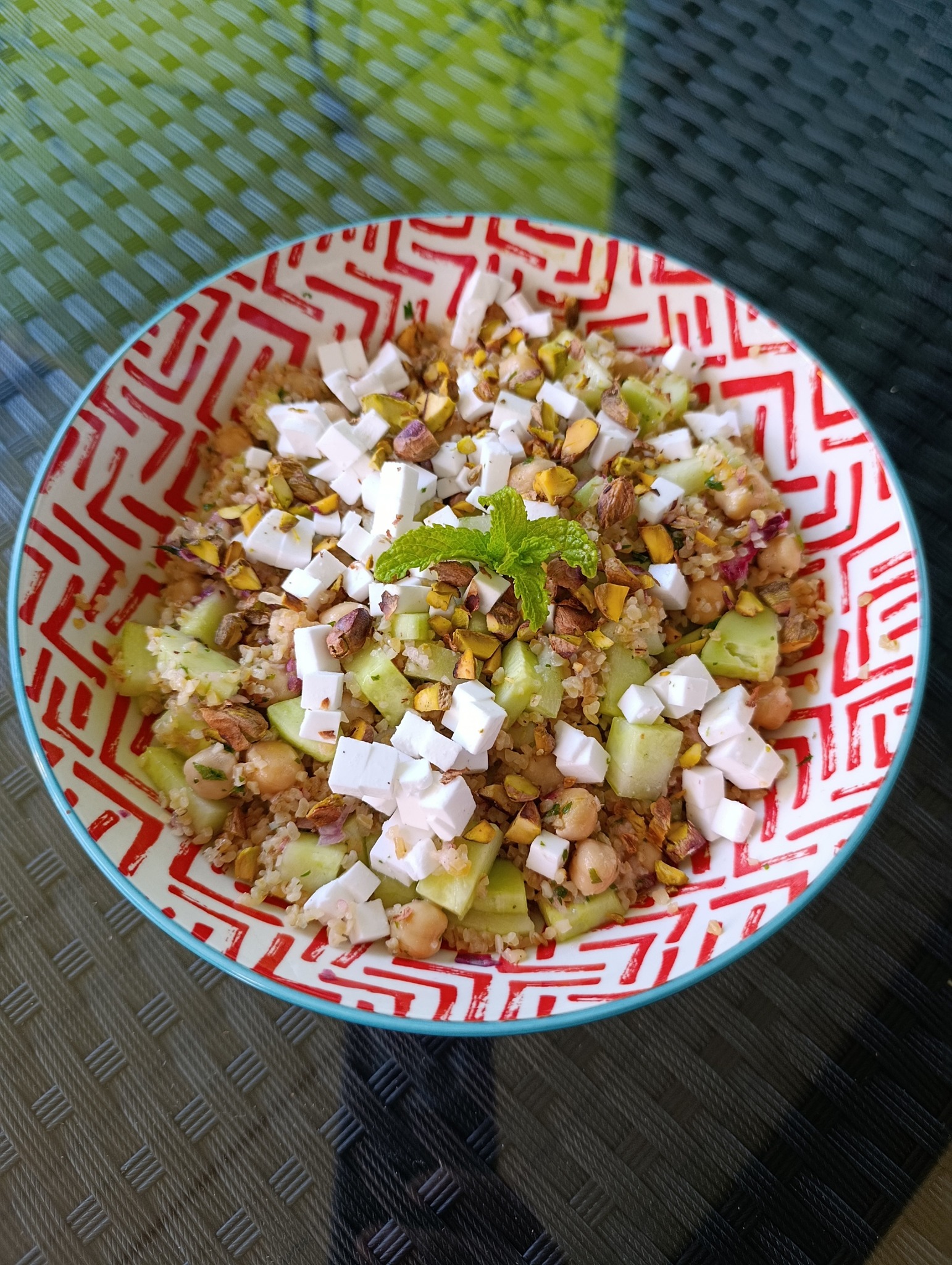 Ajouter la feta grossièrement émiettée ainsi que les pistaches (ou les noix de pécan concassées). Mélanger, puis ajouter éventuellement une feuille de menthe et de persil pour la déco.